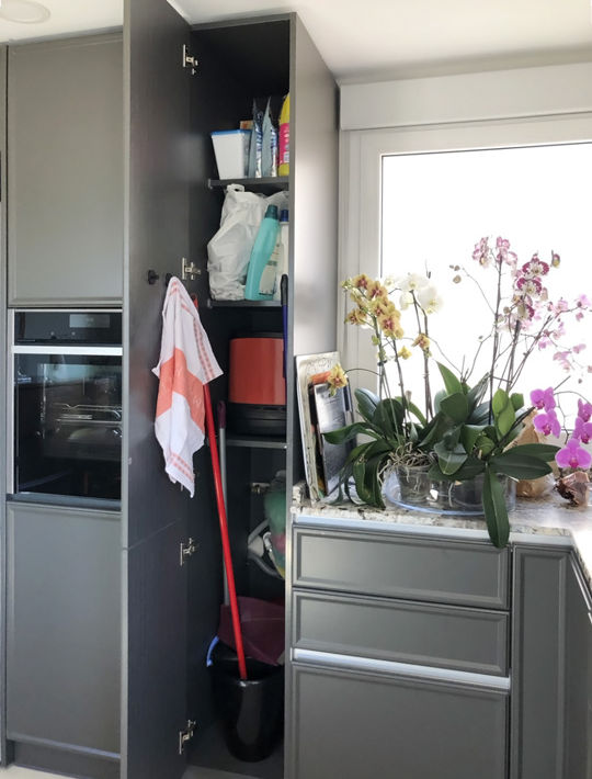 La cocina de Serge y Alejandro se distribuye en forma de "L" e incluye una zona de comedor. Contamos con una zona de columnas que incluye el frigorífico y los hornos, además de un pequeño escobero para utensilios de limpieza. La zona principal está compuesta por una gran encimera de trabajo con la zona de aguas y de cocción en el mismo frente. La campana y la caldera se han integrado en los muebles altos. Junto a la ventana hemos incluido un par de baldas decorativas en madera. Para el mobiliario hemos escogido el modelo Dakota en Gris Antracita y las encimeras son de granito natural, del modelo Lennon Gold Vintage.