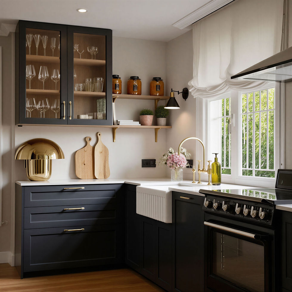 La cocina de Sheila tiene un estilo clásico con toques británicos que la hace muy especial. Hemos creado una gran zona de columnas en la que hemos integrado dos grandes zonas de despensa con un espacio desayunador en el centro. La zona de servicios queda en forma de "L" e incorpora un fregadero de porcelana y una cocina monobloque de estilo clásico. El mobiliario Nevada en negro se ha complementado con detalles en Nogal natural y encimeras porcelánicas de efecto marmol.
